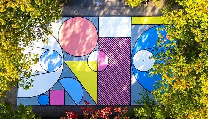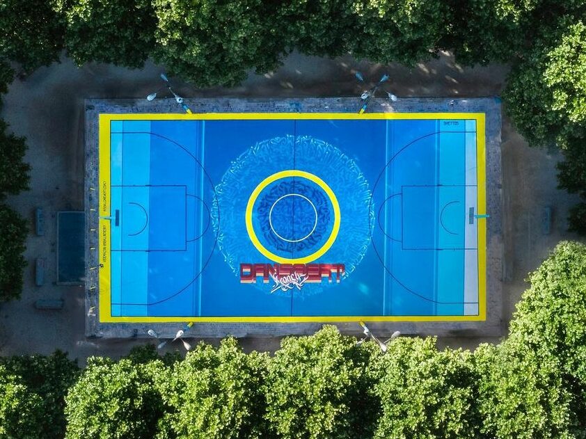 Pour ce terrain, l’artiste bruxellois Oli B – commissionné par Wham Office – a voulu créer un design suffisamment intéressant mais aussi très simple afin que le terrain reste facile à utiliser par les joueurs de basket.